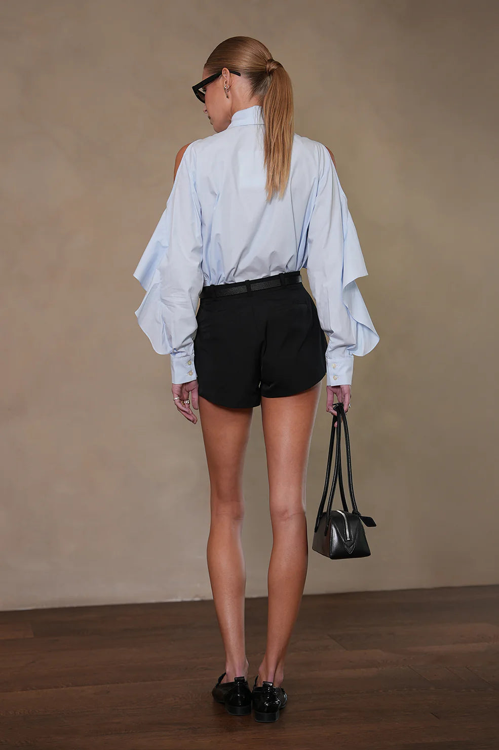 A structured play on classic tailoring — these pleated shorts in trench-inspired fabric deliver crisp ease with statement poise.