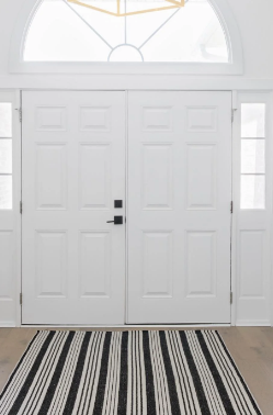 Durable elegance meets timeless texture. A classic black & ivory stripe in handwoven PET fiber made from recycled bottles—low pile, washable, and designed to transition effortlessly from porch to hallway.