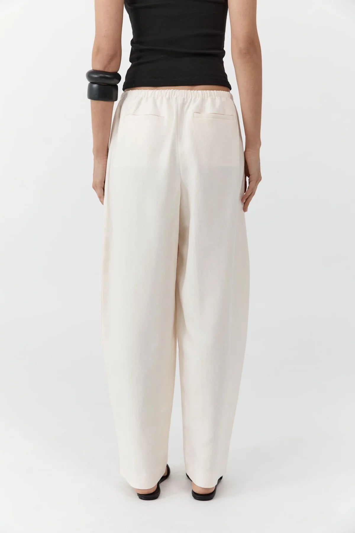 Soft, sculptural ease meets elevated minimalism — these relaxed trousers in ivory feature a refined drawstring waist and fluid tailoring that drapes effortlessly for refined everyday comfort with a luxe edge.
