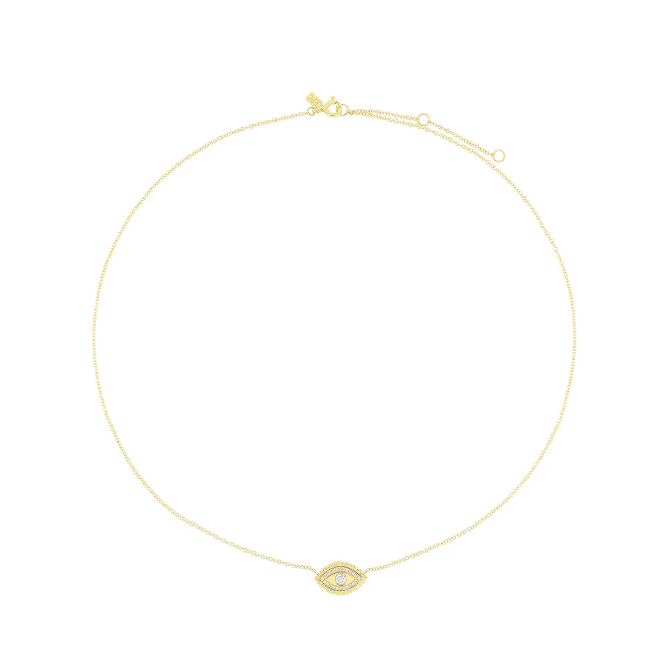 Symbolic sparkle with sacred ease. This pendant features a classic evil eye design—fluted border, central round diamond, and dainty cable chain—offering understated protection with luminous detail.