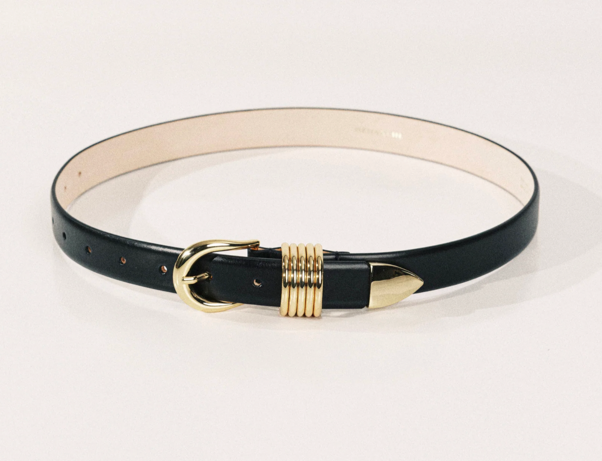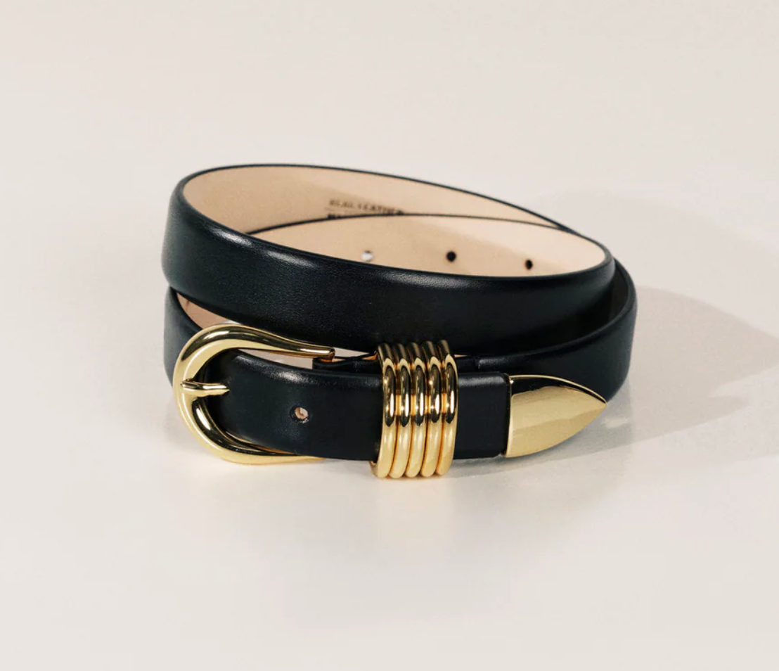 A sleek contrast in form and tone. This belt blends rich black leather with gold mixed-metal rings and ten adjustable holes—bold yet refined at your waistline.