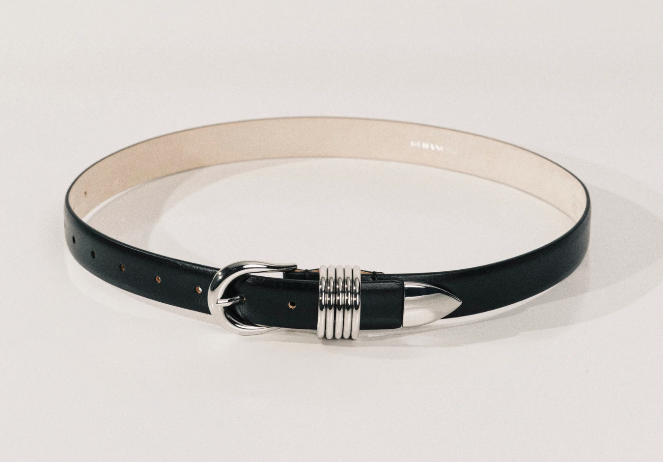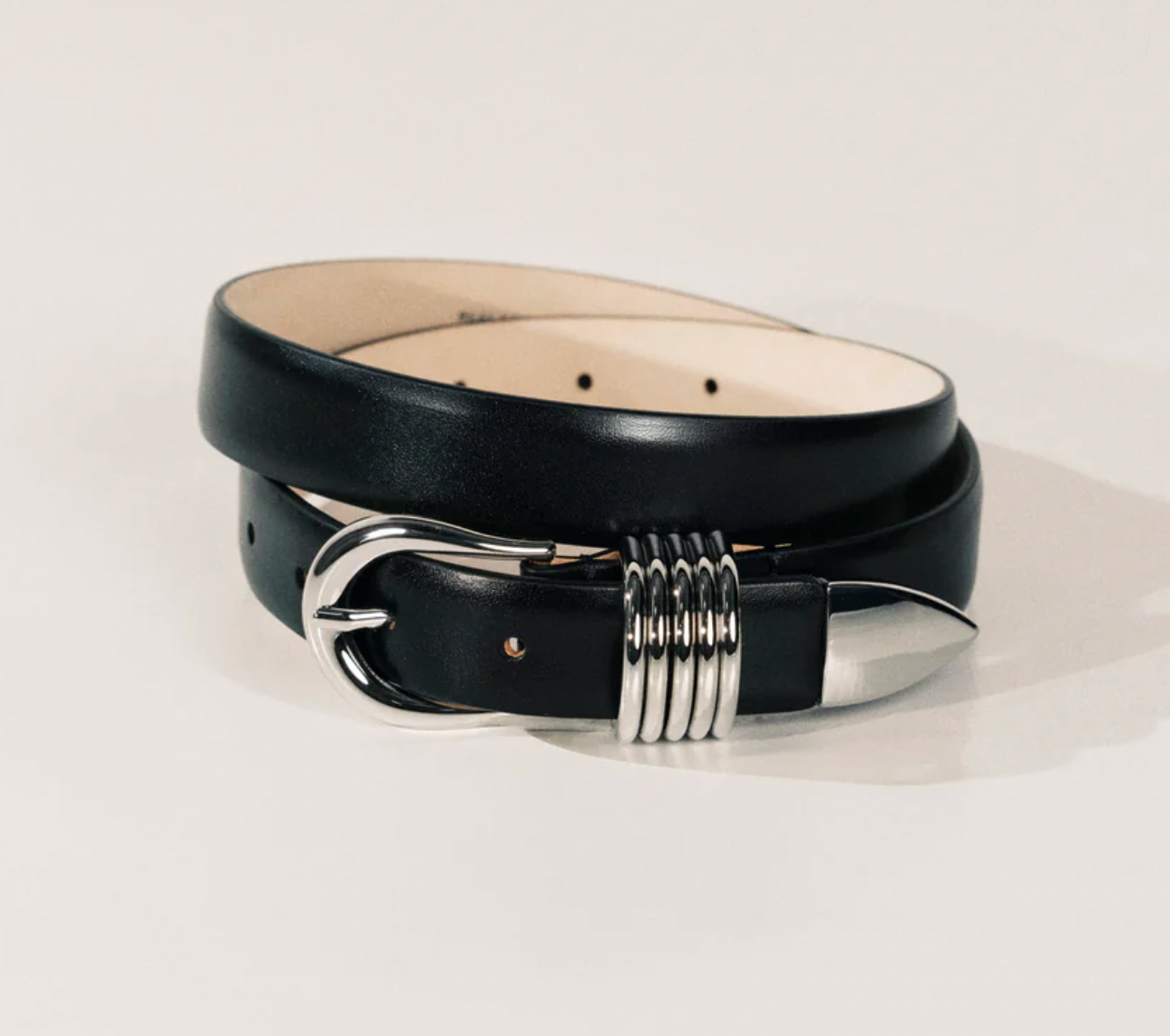 A sleek contrast in form and tone. This belt blends rich black leather with silver rings and ten adjustable holes—bold yet refined at your waistline.