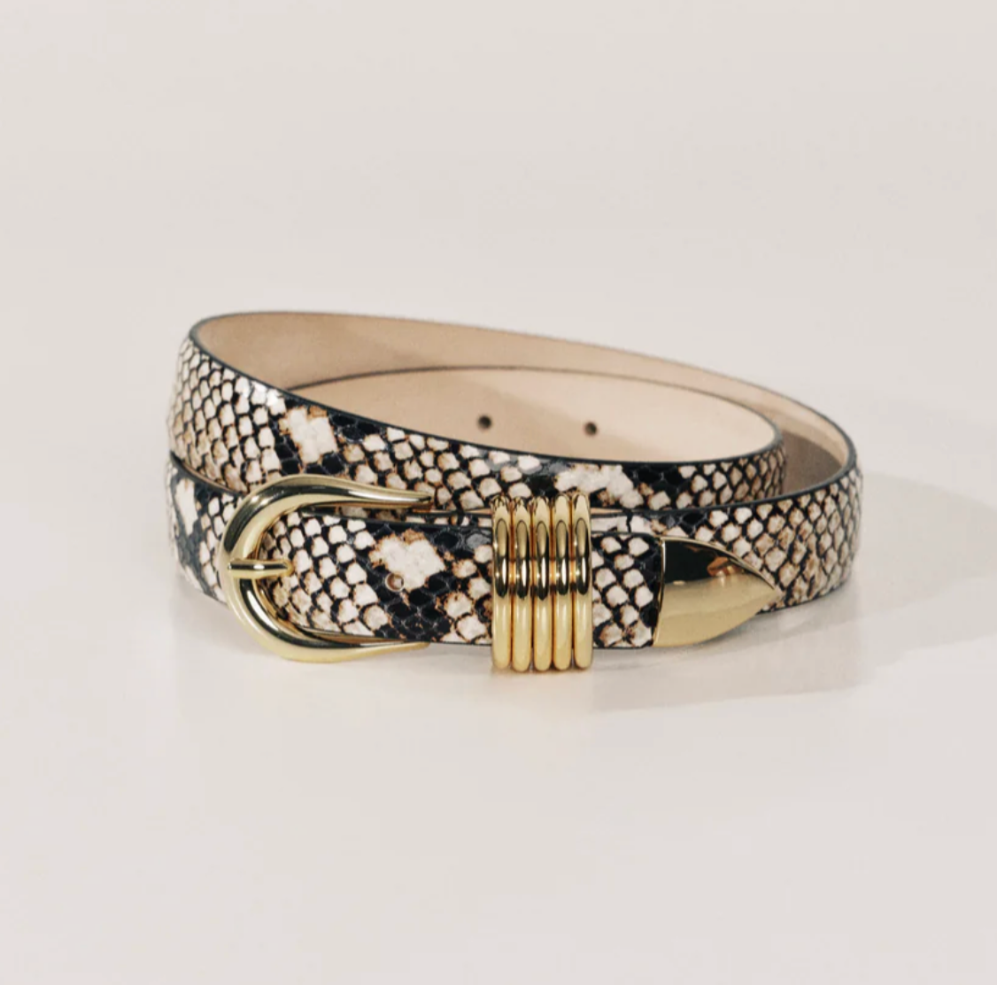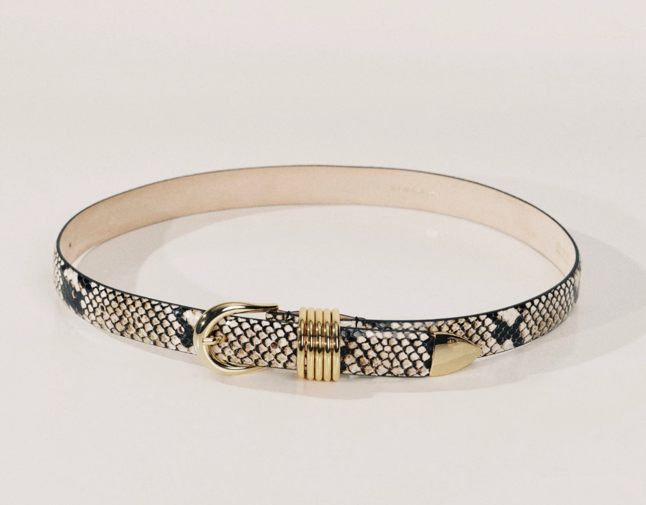 Subtle edge in luxe form. This belt blends embossed snake leather with mixed-metal silver rings and ten adjustable holes—designed to elevate while staying polished.