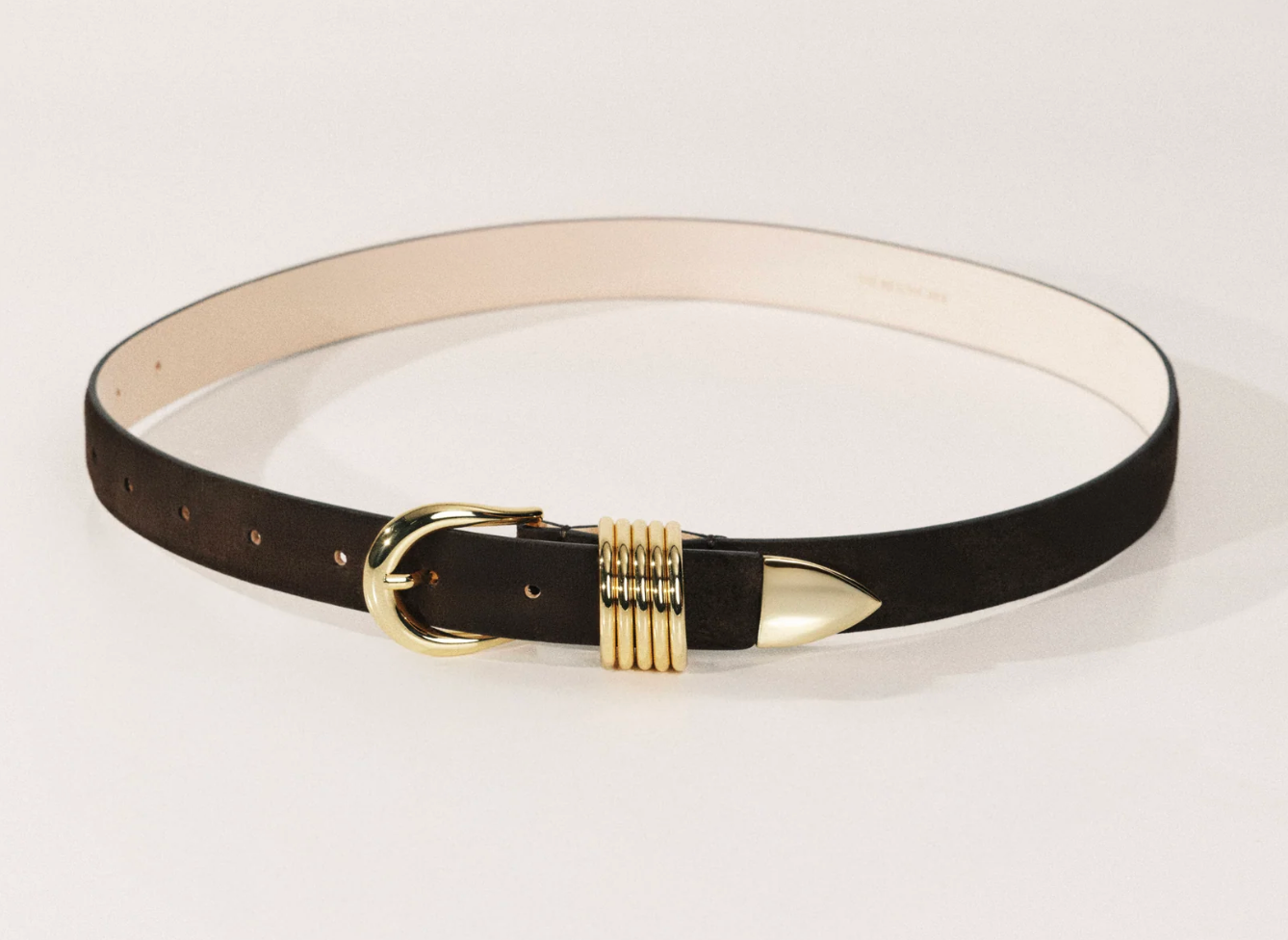 A luxe mix of depth and shine. This chocolate suede belt is crafted with elegance and features gold metal rings and ten adjustable holes—refined texture meets sculptural hardware.
