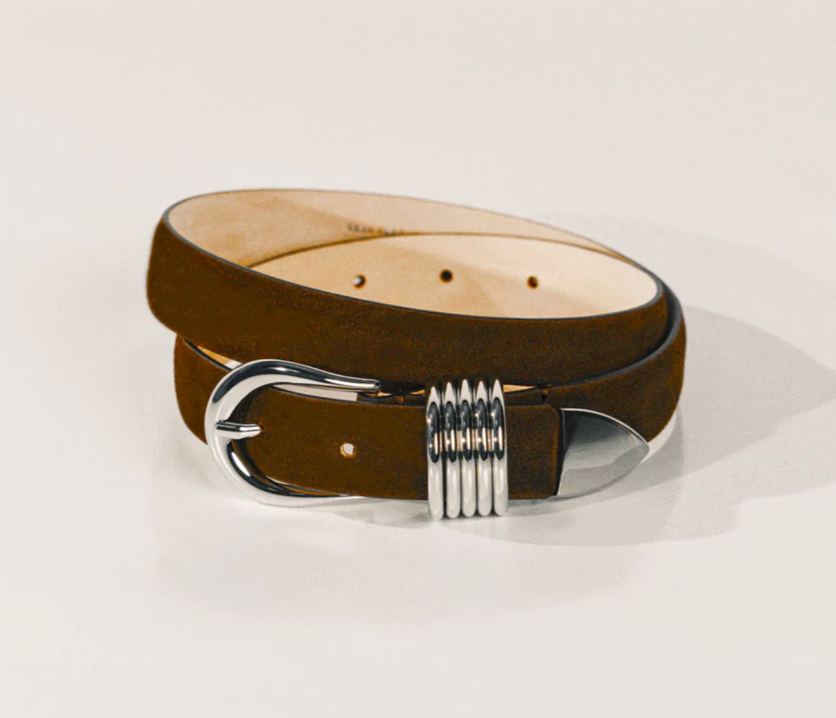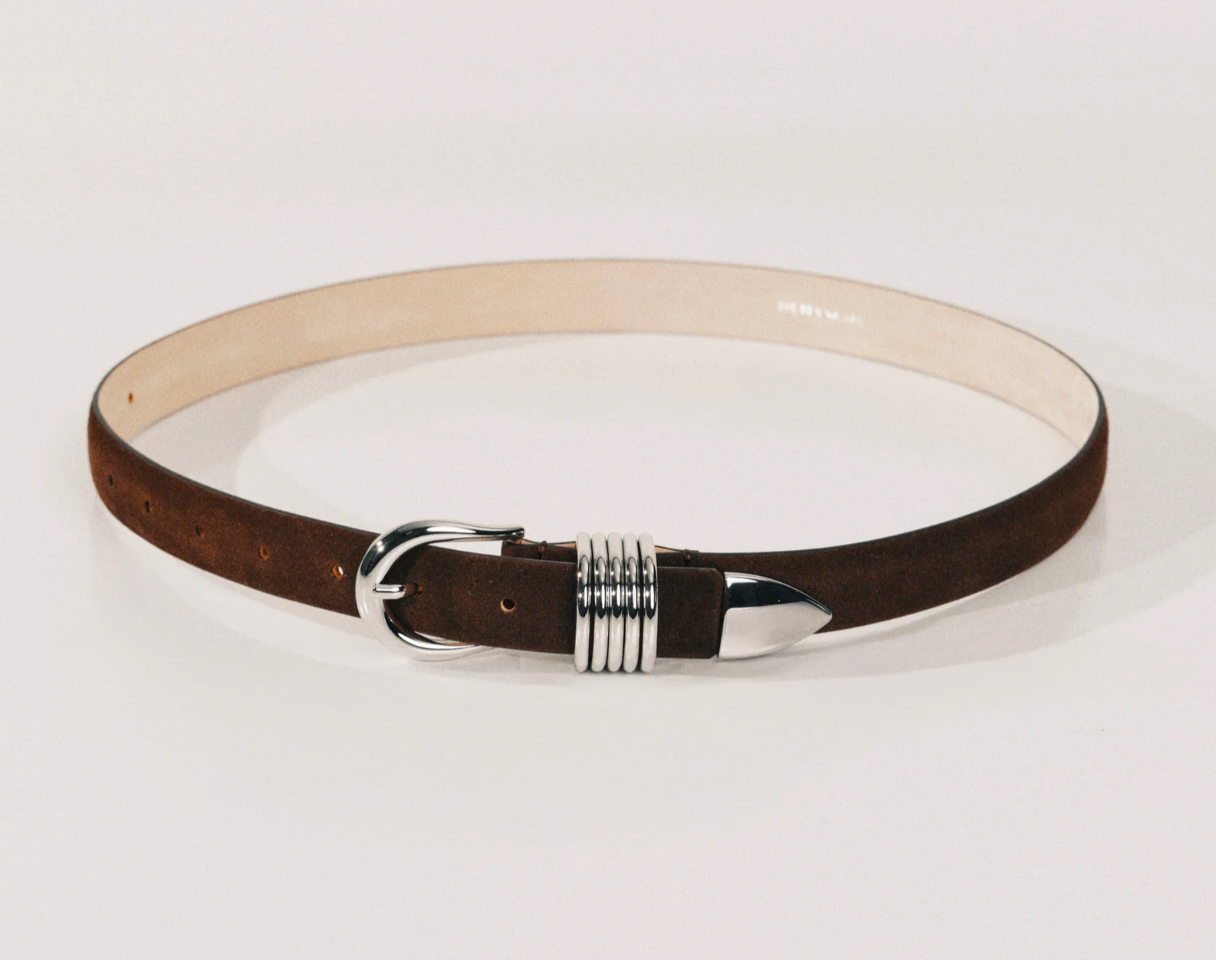 A luxe mix of depth and shine. This chocolate suede belt is crafted with elegance and features silver mixed-metal rings and ten adjustable holes—refined texture meets sculptural hardware.