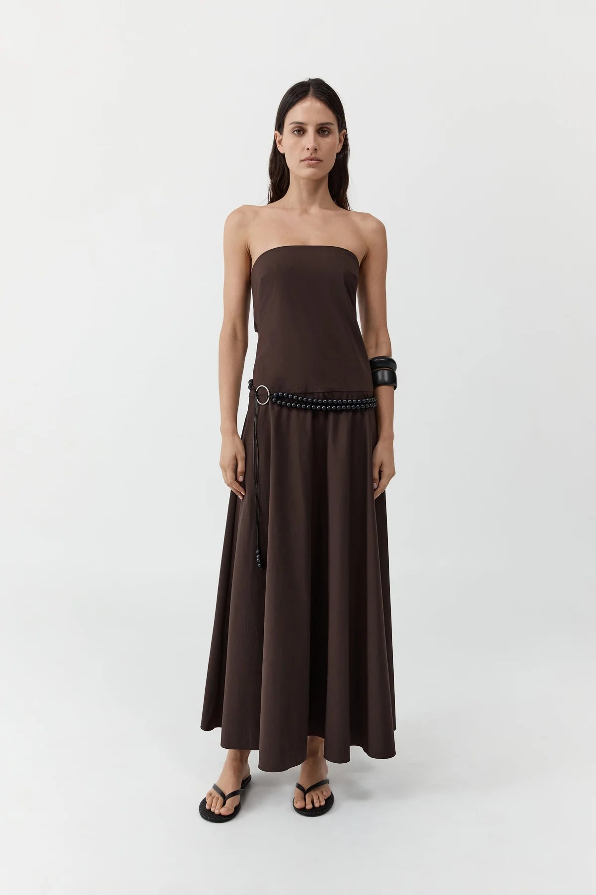 Sculptural elegance with refined minimalism — this strapless dress in a rich Bark tone features a clean neckline and subtle rouleau detailing that enhance its sleek silhouette, marrying elevated ease with quiet confidence.